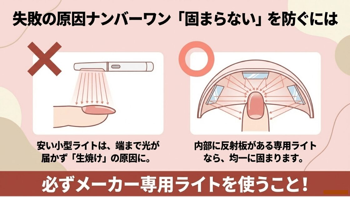 その結果、中が生焼けのような状態になり、ジェルの縮みやアレルギー反応を引き起こすリスクも高まります。安全に楽しむためには、メーカーが推奨するライトを使用し、決められた秒数を守ることが鉄則です。