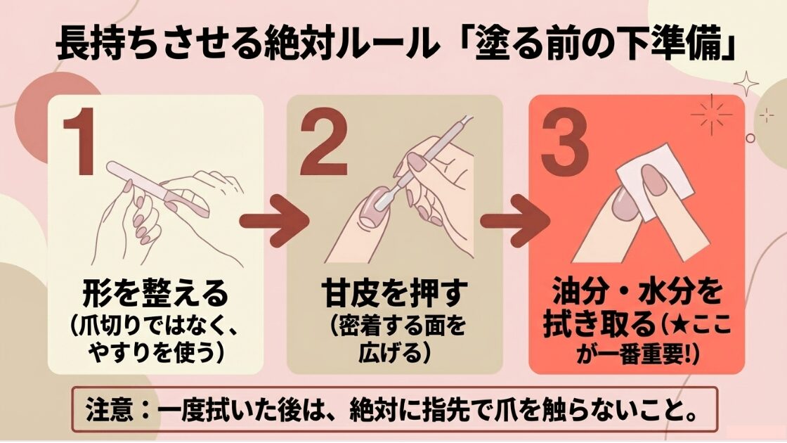 やすりで形を整え、甘皮を押し、油分・水分を拭き取るという下準備の手順。拭いた後は触らないという重要ポイントを強調