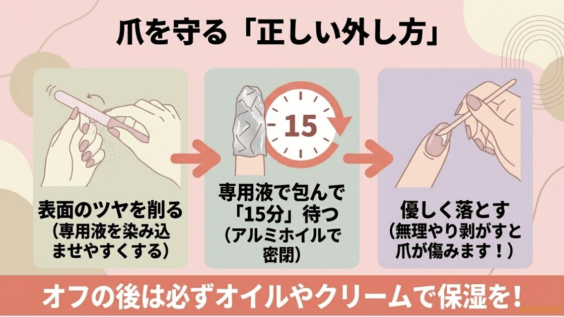 表面を削り、専用液で包んで15分待ち、優しく落とすという3ステップのオフ手順。無理に剥がすと爪が傷む注意喚起を含む図解