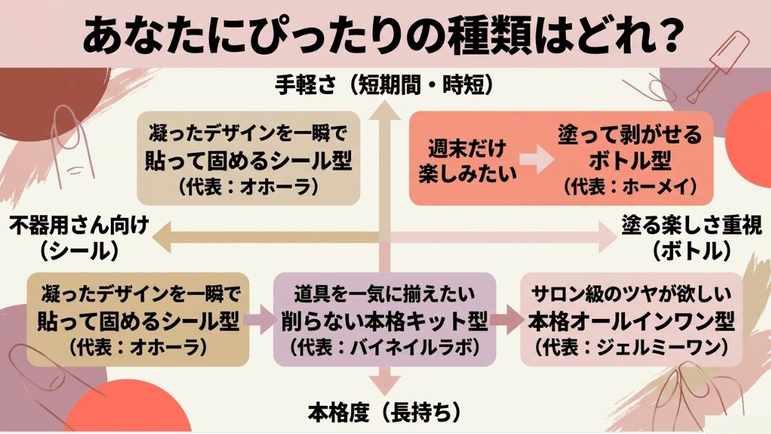 不器用さん向けのシール(オホーラ)、週末限定のボトル(ホーメイ)、本格派のキット(バイネイルラボ)などを、手軽さと本格度の軸でまとめた比較図