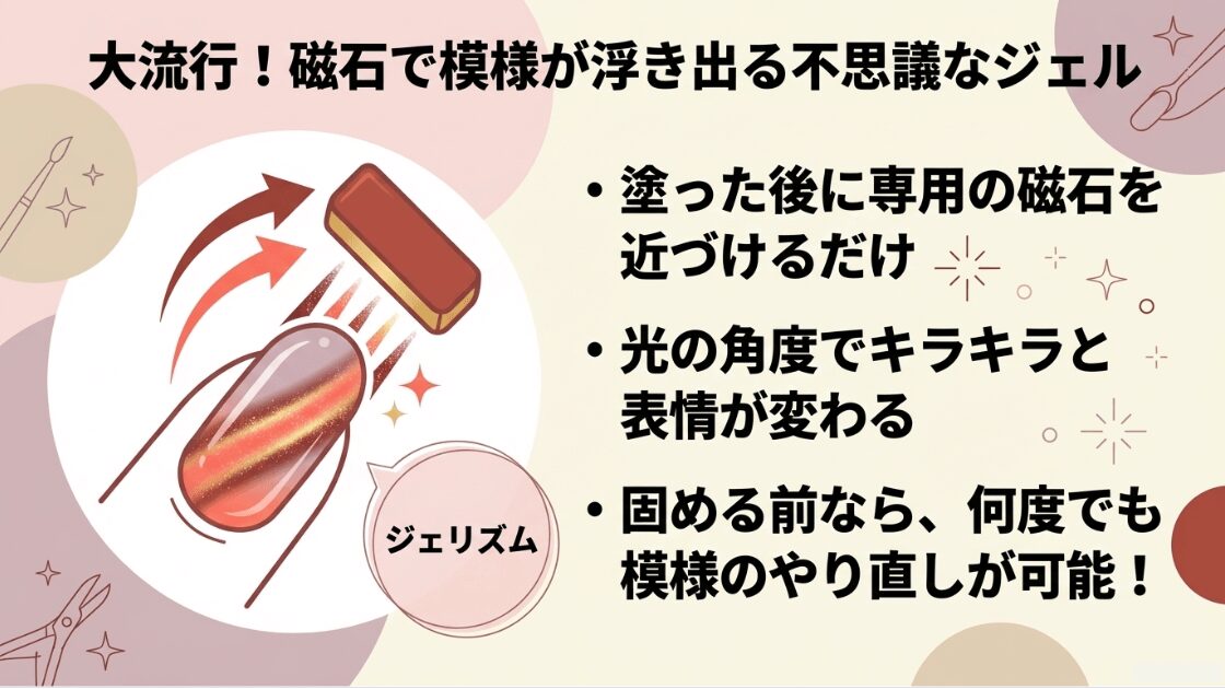 磁石で模様が浮き出るジェリズムの紹介。塗った後に専用磁石を近づけるだけでキラキラと表情が変わり、固める前なら何度でもやり直しが可能な点を図解