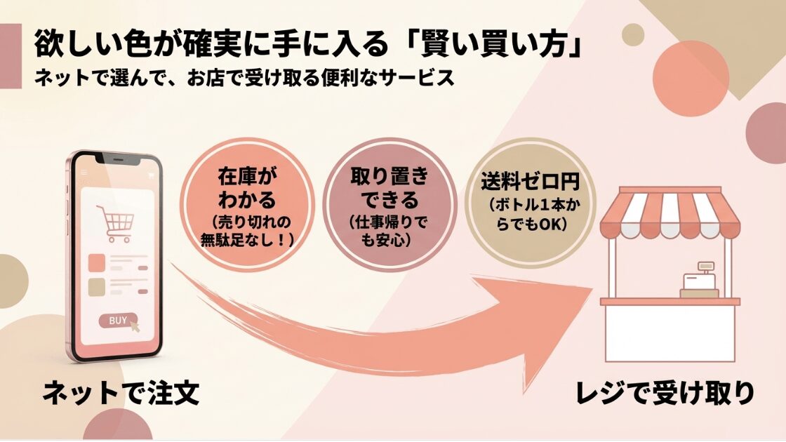 ネットで注文しレジで受け取る流れを図解。在庫がわかり、取り置き可能で、ボトル1本から送料無料になるメリットを紹介