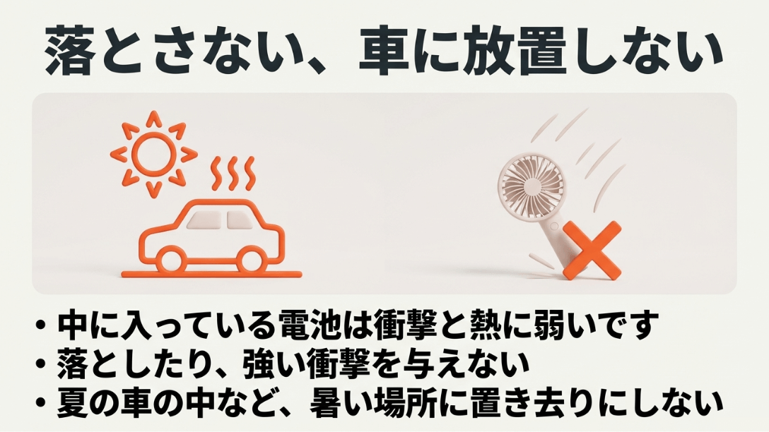 便利なハンディファンですが、ここ数年、リチウムイオン電池に起因する発火や爆発事故がニュースになることも増えました。事故の原因を紐解いてみると、その多くは間違った使い方や予期せぬ衝撃にあります。