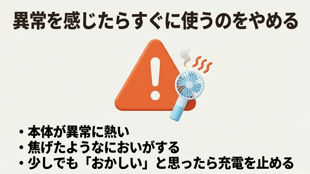 万が一、ハンディファンを使用中や充電中に煙が出たり、火花が散ったりした場合は、パニックにならずに以下の対応を心がけてください。