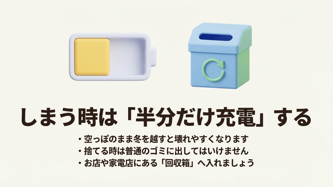 50〜80%程度まで充電してから湿気の少ない涼しい場所に保管するのが、来年も元気に動いてもらうためのコツです。