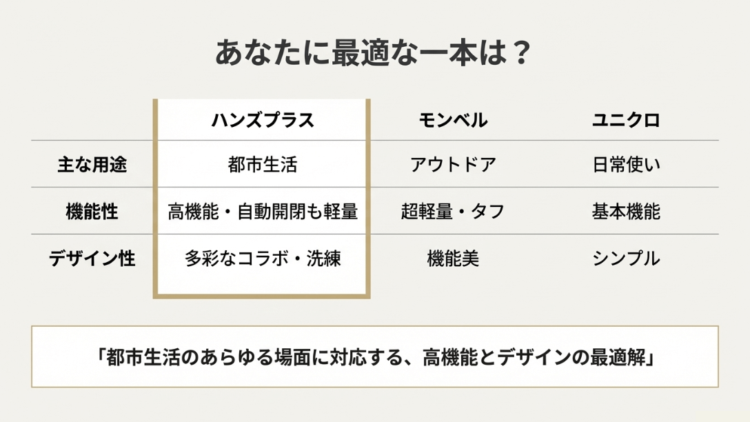 それぞれに素晴らしい特徴がありますが、ハンズプラスの日傘との違いを明確にすることであなたにとっての「最適解」が見えてくるはずです。主要なスペックを比較表にまとめてみました。