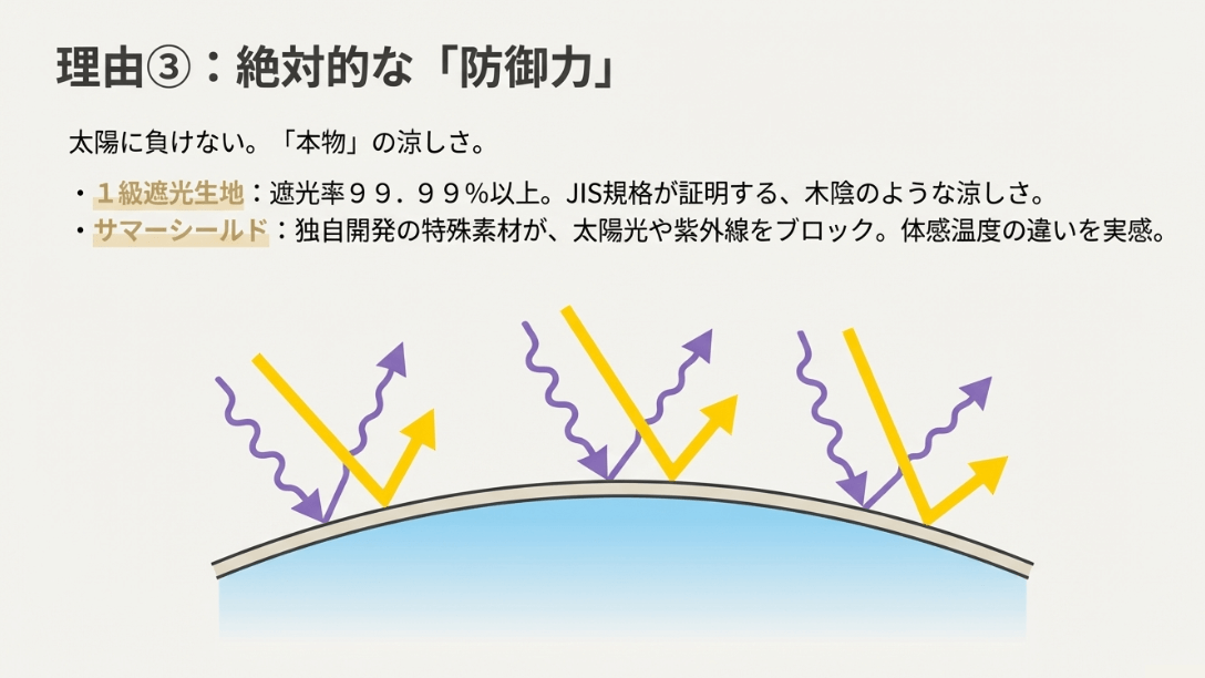 1級遮光やサマーシールド(東レ)採用で体感温度を下げる