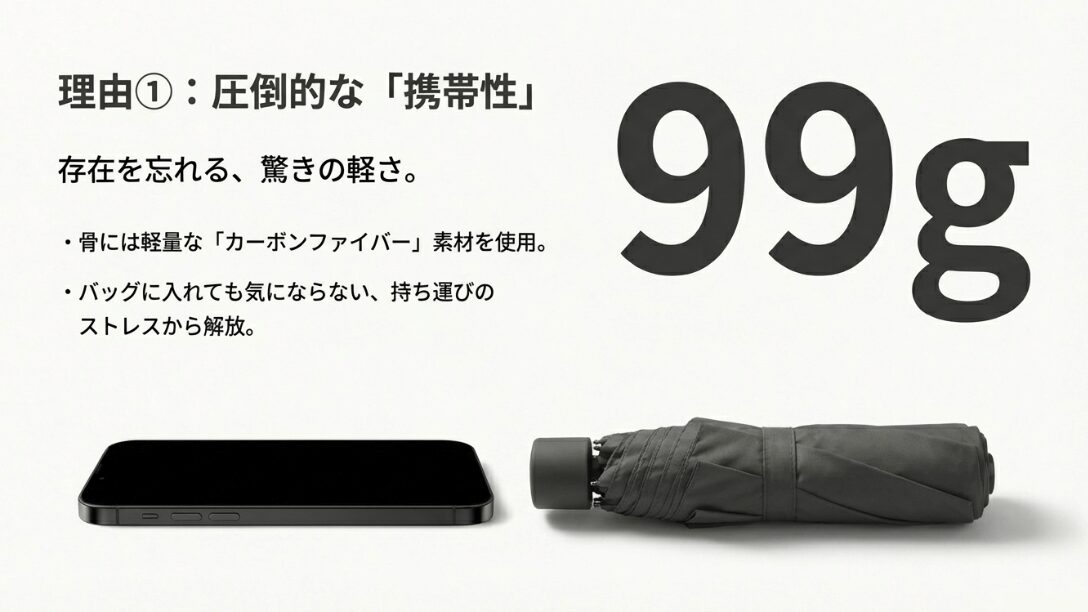 99gの超軽量な折りたたみ傘は毎日持ち歩ける軽さ