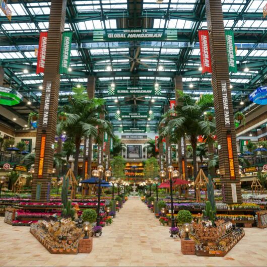 そして何より、視界を埋め尽くす植物たちの密度が違います。立体的にディスプレイされた草花、見上げるような巨大なヤシの木、所狭しと並べられた噴水やオーナメントなど、その光景はまさに「室内の植物園」や「ジャングル」と呼ぶにふさわしい迫力です。