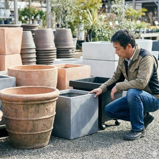 • ファイバークレイ(強化繊維セメント): テラコッタのような重厚な見た目でありながら、比較的軽量で割れにくい。近年人気の素材。価格はやや高め。