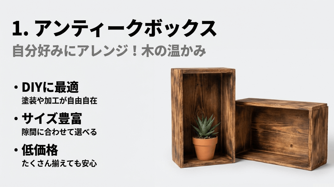 DIYに最適で低価格な木製アンティークボックスの紹介スライド