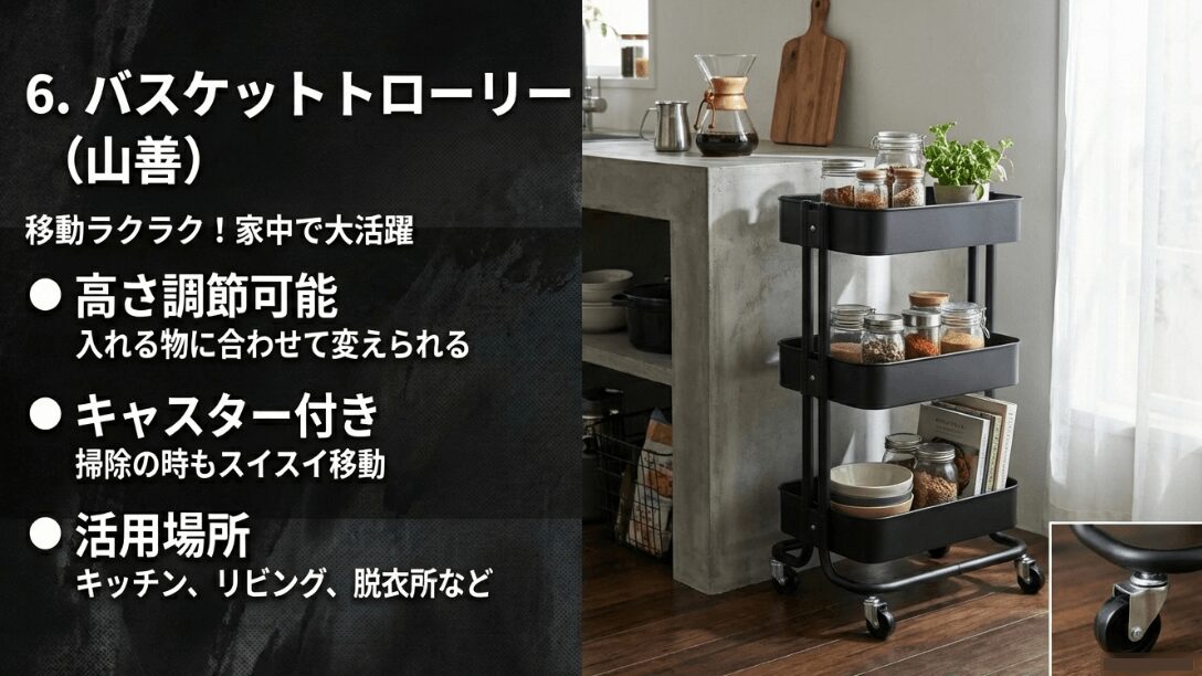大手メーカー品の中でも、ハンズマンで絶大な支持を得ているのが山善(YAMAZEN)の「バスケットトローリー」です。この商品の凄さは、なんといってもそのカスタマイズ性に尽きます。一般的なトローリーは棚の位置が固定されていることが多いのですが、山善のものは2.5cm単位で高さを自由に変えられるのです。