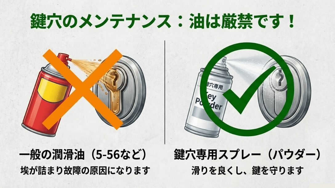 掃除機で鍵穴のホコリを吸い出し、専用スプレーを一吹きするだけで、見違えるようにスムーズに回ることがあります。