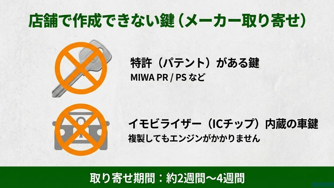 一方で、美和ロック(MIWA)のPR/PSシリンダーや、カバ(KABA)の登録制キーなど特許技術が使われている鍵や、セキュリティが非常に厳しい鍵は店舗で削ることが法的に、あるいは物理的に不可能です。