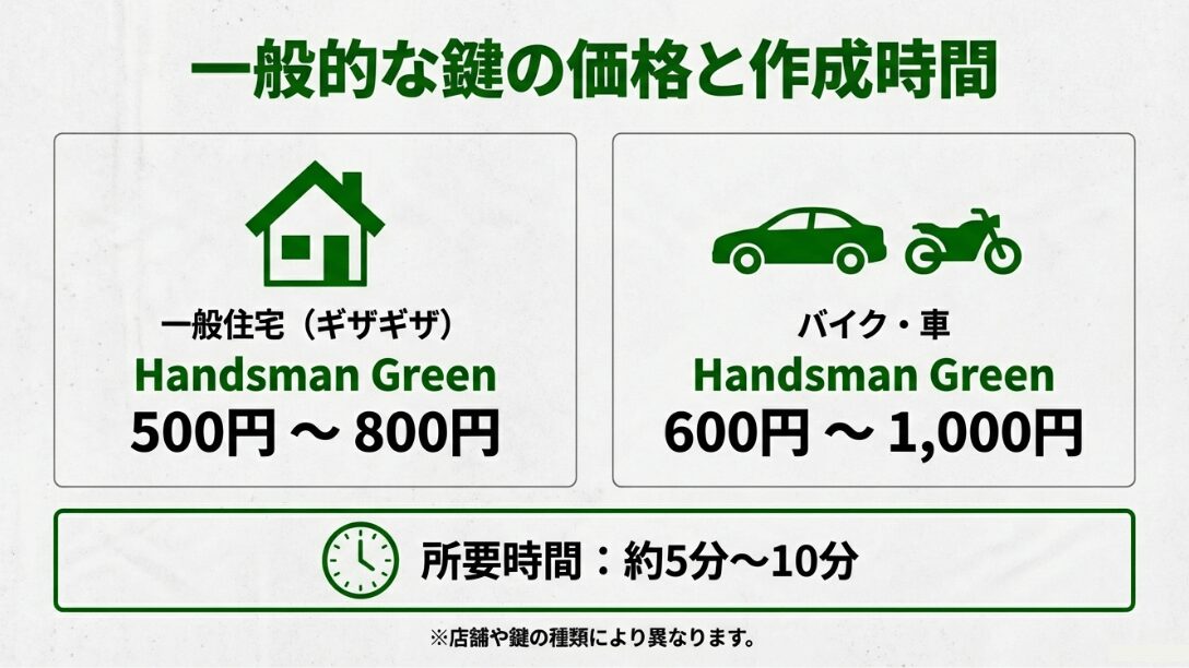 | 国産車・バイク(板キー) | 600円 ~ 1,000円 | 900円 ~ 1,500円 | 5,000円 ~ 8,000円 |